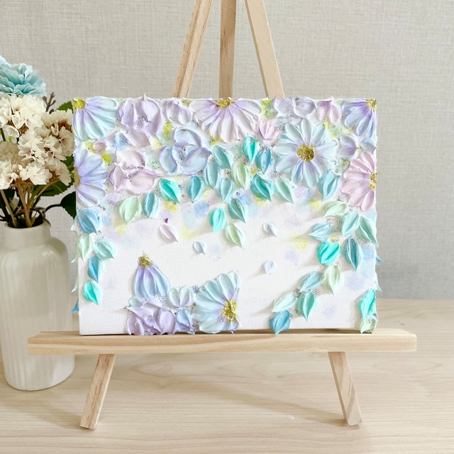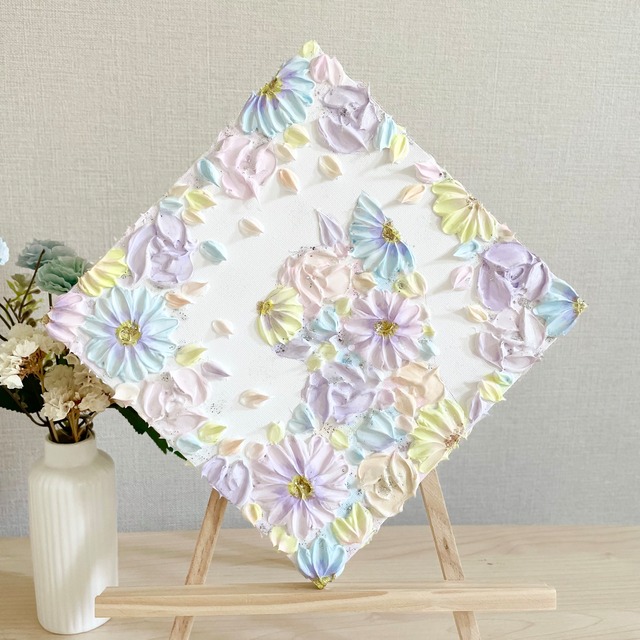❀ まるで花の夢の中に迷い込んだような、優しく儚い世界。 表面はガラスのような艶をまとい、散りばめたラメが光を受けて静かにきらめきます。 見るたびに心がふっと和らぐ、可憐で幻想的な一点物のアートです。 ❀ 光沢感のある独特な質感と、立体感が特徴のアート作品です。 一点ずつ異なる表情を楽しんでいただける、世界にひとつだけの仕上がりです。 ラメをふんだんに使用しており、見る角度によってキラキラ輝きます。 【ギフトラッピングについて】 ご希望の方は、150円でラッピングいたします。ご購入前にコメントをお願いいたします。 【飾り方について】 こちらの作品は「張りキャンバス仕上げ」ですので、そのまま壁に飾っていただけます。軽量のため、画鋲やピン、壁用フックを使えば簡単に取り付け可能です。 棚や家具の上に立て掛けてもおしゃれにお楽しみいただけます♪ ※裏面に紐や金具などは付けておりませんが、必要に応じてご自身で取り付けていただくことも可能です。 【サイズ】 20㎝×20㎝正方形の張りキャンバスを斜め(ひし形)に使っています。 おもにモデリングペースト、クリスタルメディウム、アクリル絵の具を使用しています。 ※こちらの作品は、他サイトでも同時に販売しております。 タイミングによっては売り切れとなる場合がございますので、気になる方はお早めのご購入をおすすめいたします。
