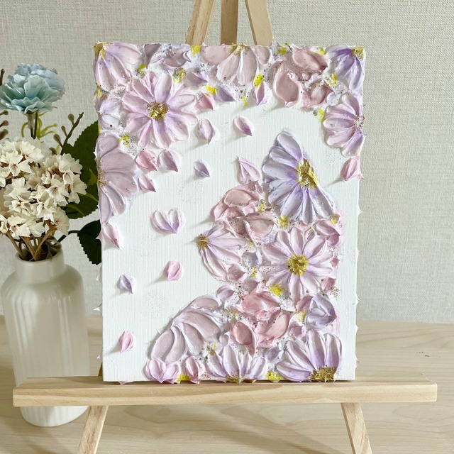 ❀ やわらかな白を基調に、ほんのり淡い桃色を纏った白猫のアート。 ホワイトのツヤ感で白猫の美しさを表現し、光を受けて上品にきらめきます。 ホワイト一色のシンプルなカラーなので、場所を選ばず飾りやすく、ホワイトインテリアにもぴったり。 猫好きさんにぜひ手に取っていただきたい、清らかで可憐な一枚です。 ❀ 光沢感のある独特な質感と、立体感が特徴のアート作品です。 一点ずつ異なる表情を楽しんでいただける、世界にひとつだけの仕上がりです。 ラメやパールビーズをふんだんに使用しており、見る角度によってキラキラ輝きます。 【飾り方について】 こちらの作品は「張りキャンバス仕上げ」ですので、そのまま壁に飾っていただけます。軽量のため、画鋲やピン、壁用フックを使えば簡単に取り付け可能です。 棚や家具の上に立て掛けてもおしゃれにお楽しみいただけます♪ ※裏面に紐や金具などは付けておりませんが、必要に応じてご自身で取り付けていただくことも可能です。 【サイズ】 18㎝×14㎝ 張りキャンバス おもにモデリングペースト、アクリル絵の具、クリスタルメディウムを使用しています。 ※こちらの作品は、他サイトでも同時に販売しております。 タイミングによっては売り切れとなる場合がございますので、気になる方はお早めのご購入をおすすめいたします。 #テクスチャーアート #原画 #アートパネル #ウォールインテリア #手作り #ハンドメイド #絵画 #張りキャンバス #ミニキャンバス #インテリア #壁掛け #モデリングペースト #アクリル絵の具 #アクリルガッシュ #花 #フラワー #立体アート
