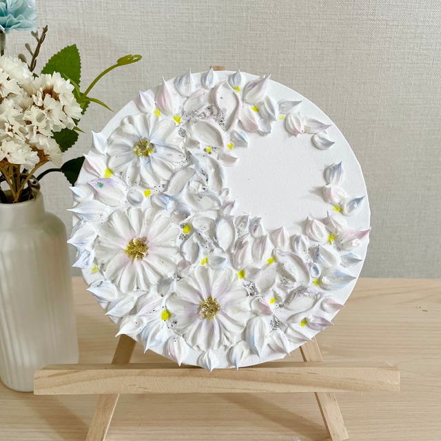 ❀ 淡い月の光に照らされて満開に咲き誇る三日月のリース。 涼しげな空の静けさの中に、花々の命が息づくような、幻想的な世界を表現しました。 ❀三日月リースには、物事の始まりや成長、発展、幸運、永遠、幸福といった意味があり、幸運のお守りとして飾られることがあります。 新たな門出をそっと彩るようなデザインで、結婚祝いや引っ越し祝いなど、大切な方への贈り物にもおすすめです。 ❀ 光沢感のある独特な質感と、立体感が特徴のアート作品です。 一点ずつ異なる表情を楽しんでいただける、世界にひとつだけの仕上がりです。 ラメを使用しており、見る角度によってキラキラ輝きます。 【飾り方について】 こちらの作品は「張りキャンバス仕上げ」ですので、そのまま壁に飾っていただけます。軽量のため、画鋲やピン、壁用フックを使えば簡単に取り付け可能です。 棚や家具の上に立て掛けてもおしゃれにお楽しみいただけます♪ ※裏面に紐や金具などは付けておりませんが、必要に応じてご自身で取り付けていただくことも可能です。 裏面は丸型キャンバス特有の仕様上、布の折り込みや金具が見えています。表面の仕上がりには影響ありませんのでご安心ください。 【サイズ】 15㎝ 丸型キャンバス おもにモデリングペースト、アクリル絵の具を使用しています。 ※こちらの作品は、他サイトでも同時に販売しております。 タイミングによっては売り切れとなる場合がございますので、気になる方はお早めのご購入をおすすめいたします。 #テクスチャーアート #原画 #アートパネル #ウォールインテリア #手作り #ハンドメイド #絵画 #丸型キャンバス #ミニキャンバス #インテリア #壁掛け #モデリングペースト #アクリル絵の具 #アクリルガッシュ #花 #フラワー #立体アート #張りキャンバス