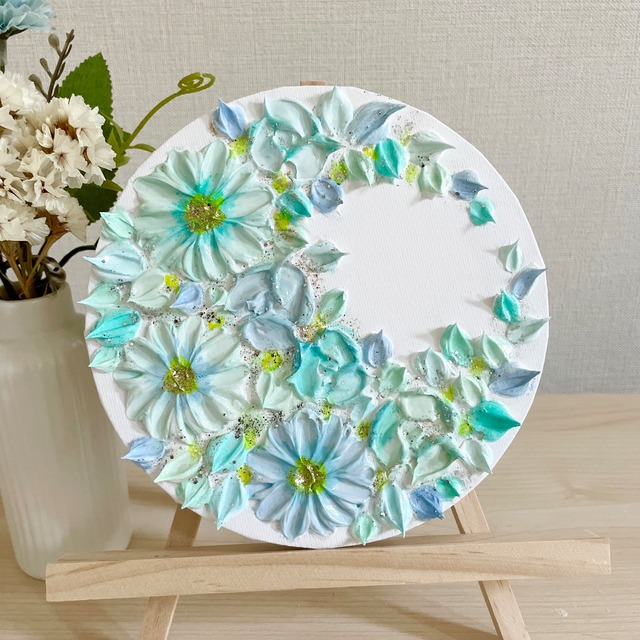 ❀ ひんやりとした空気をまとった、淡く澄んだカラーが織りなす三日月リースです。 小ぶりな15cmの丸型キャンバスに、涼しげで儚げな印象の色彩を丁寧に重ね、氷のように透明感のある世界を表現しました。 光に当たるとやさしく輝くラメが、静かな月の夜を連想させ、見るたびに心がすっと落ち着くような存在感があります。 どんなインテリアにもすっとなじむ淡いカラーで、暑い季節にもぴったりの爽やかな一点です。 玄関やデスクまわり、寝室など、ちょっとしたスペースに飾っていただくのもおすすめです。 ❀三日月リースには、物事の始まりや成長、発展、幸運、永遠、幸福といった意味があり、幸運のお守りとして飾られることがあります。 新たな門出をそっと彩るようなデザインで、結婚祝いや引っ越し祝いなど、大切な方への贈り物にもおすすめです。 ❀ 光沢感のある独特な質感と、立体感が特徴のアート作品です。 一点ずつ異なる表情を楽しんでいただける、世界にひとつだけの仕上がりです。 【飾り方について】 こちらの作品は「張りキャンバス仕上げ」ですので、そのまま壁に飾っていただけます。軽量のため、画鋲やピン、壁用フックを使えば簡単に取り付け可能です。 棚や家具の上に立て掛けてもおしゃれにお楽しみいただけます♪ ※裏面に紐や金具などは付けておりませんが、必要に応じてご自身で取り付けていただくことも可能です。 裏面は丸型キャンバス特有の仕様上、布の折り込みや金具が見えています。表面の仕上がりには影響ありませんのでご安心ください。 【サイズ】 15㎝ 丸型キャンバス おもにモデリングペースト、アクリル絵の具を使用しています。 ※こちらの作品は、他サイトでも同時に販売しております。 タイミングによっては売り切れとなる場合がございますので、気になる方はお早めのご購入をおすすめいたします。 #テクスチャーアート #原画 #アートパネル #ウォールインテリア #ハンドメイド #丸型キャンバス #ミニキャンバス #インテリア #壁掛け #モデリングペースト #アクリル絵の具 #アクリルガッシュ #花 #フラワー #立体アート