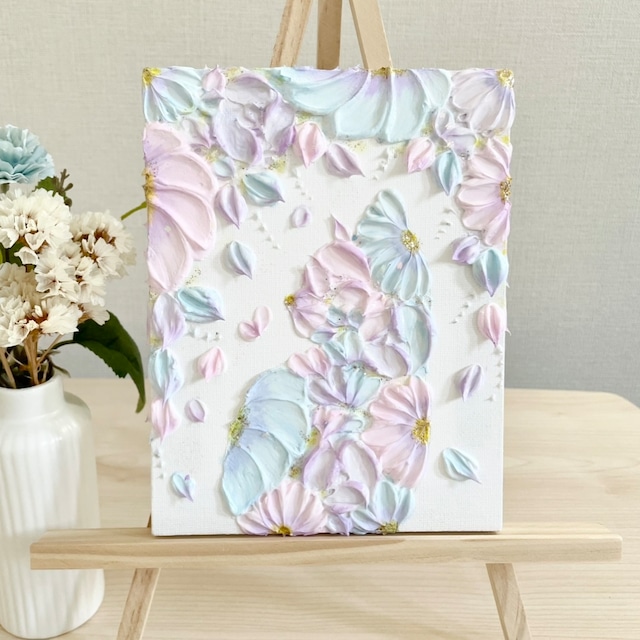 こちらはオーダー作品です。 春のやわらかな光に包まれるような、パステルピンクと水色で描いた花猫さん。 咲きはじめの花の色や、澄んだ春空を重ね、見る人の心がふっとほどけるような穏やかな色合いを意識しました。 淡くやさしい色合いがお好きな方からの色違いオーダー作品です。 おもにモデリングペースト、アクリル絵の具、クリスタルメディウムを使用しています。 【飾り方について】 こちらの作品は「張りキャンバス仕上げ」ですので、そのまま壁に飾っていただけます。軽量のため、画鋲やピン、壁用フックを使えば簡単に取り付け可能です。 棚や家具の上に立て掛けてもおしゃれにお楽しみいただけます♪