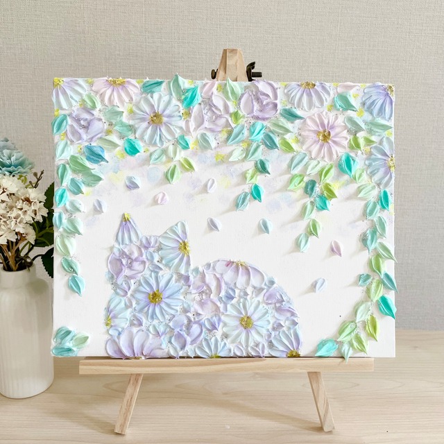 ❀ 純白の雪の花を、そっと見上げる猫。 静けさの中に舞うホワイトブルーの花々が、 冬の透明な光を映し出しています。 凛とした空気の中にも、やさしい温もりを感じる一枚です。 ⭐︎ホワイトの花々はカラー変更できます。 お写真ようなの淡いブルーホワイトは完成品のため2日以内に発送可能です。 淡いピンクホワイトは受注制作のため、発送まで7日ほどお時間をいただきます。 ❀ 光沢感のある独特な質感と、立体感が特徴のアート作品です。 一点ずつ異なる表情を楽しんでいただける、世界にひとつだけの仕上がりです。 ラメをふんだんに使用しており、見る角度によってキラキラ輝きます。 【飾り方について】 こちらの作品は「張りキャンバス仕上げ」ですので、そのまま壁に飾っていただけます。軽量のため、画鋲やピン、壁用フックを使えば簡単に取り付け可能です。 棚や家具の上に立て掛けてもおしゃれにお楽しみいただけます♪ ※裏面に紐や金具などは付けておりませんが、必要に応じてご自身で取り付けていただくことも可能です。 【サイズ】 27.3㎝×22㎝ 張りキャンバス おもにモデリングペースト、アクリル絵の具、クリスタルメディウムを使用しています。 ※こちらの作品は、他サイトでも同時に販売しております。 タイミングによっては売り切れとなる場合がございますので、気になる方はお早めのご購入をおすすめいたします。 #テクスチャーアート #原画 #アートパネル #ウォールインテリア #手作り #ハンドメイド #絵画 #張りキャンバス #ミニキャンバス #インテリア #壁掛け #モデリングペースト #アクリル絵の具 #アクリルガッシュ #花 #フラワー #立体アート