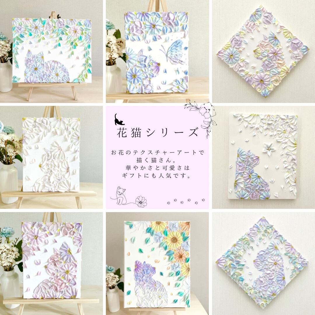 花で描いた猫のキャンバスアート。