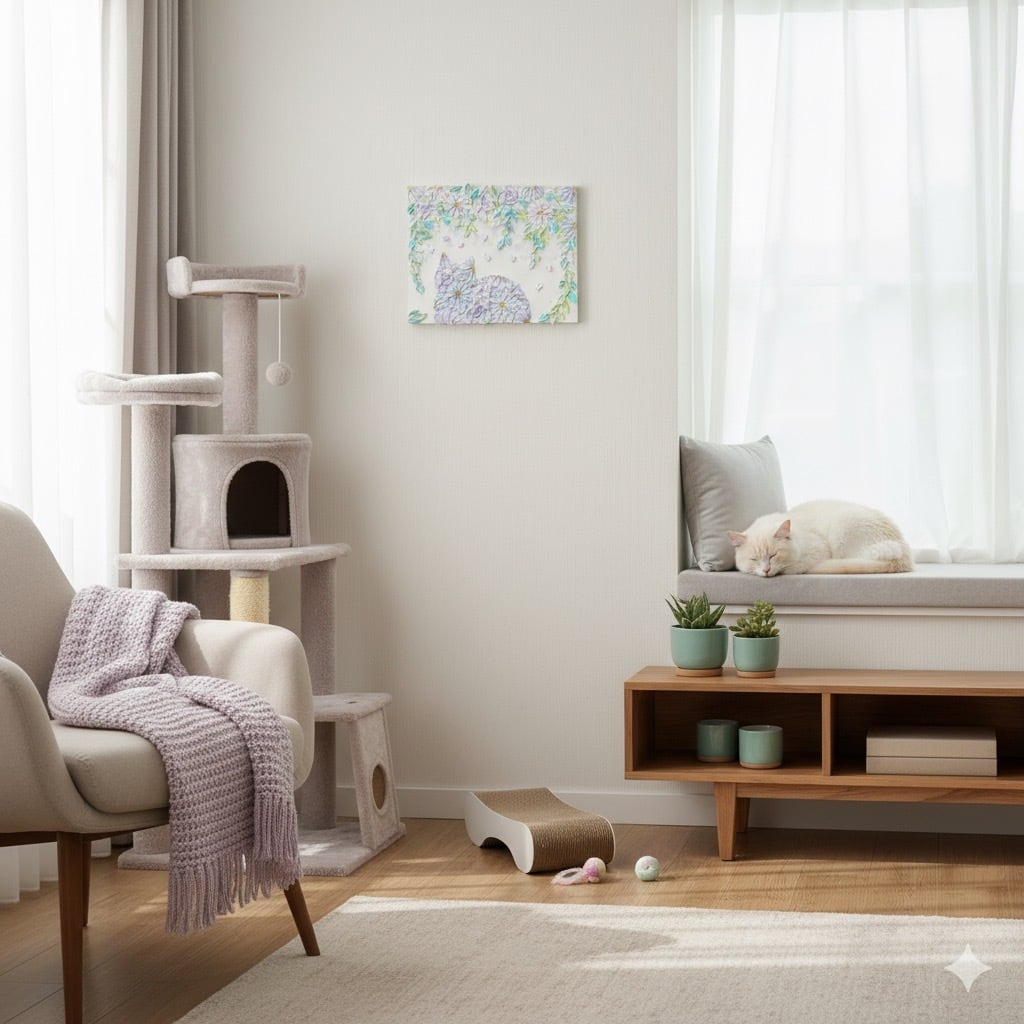 「ここにいるだけで幸せ」――そんな猫の気持ちが伝わってくるような、癒しのアートです。