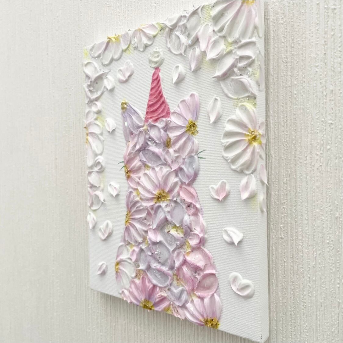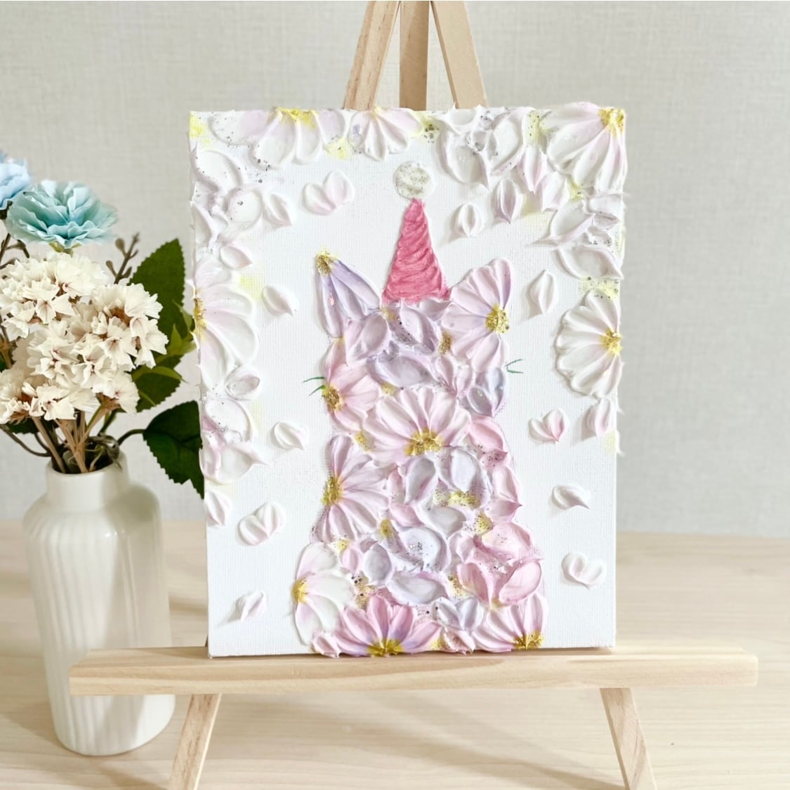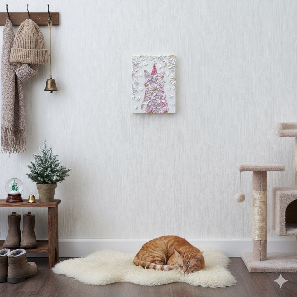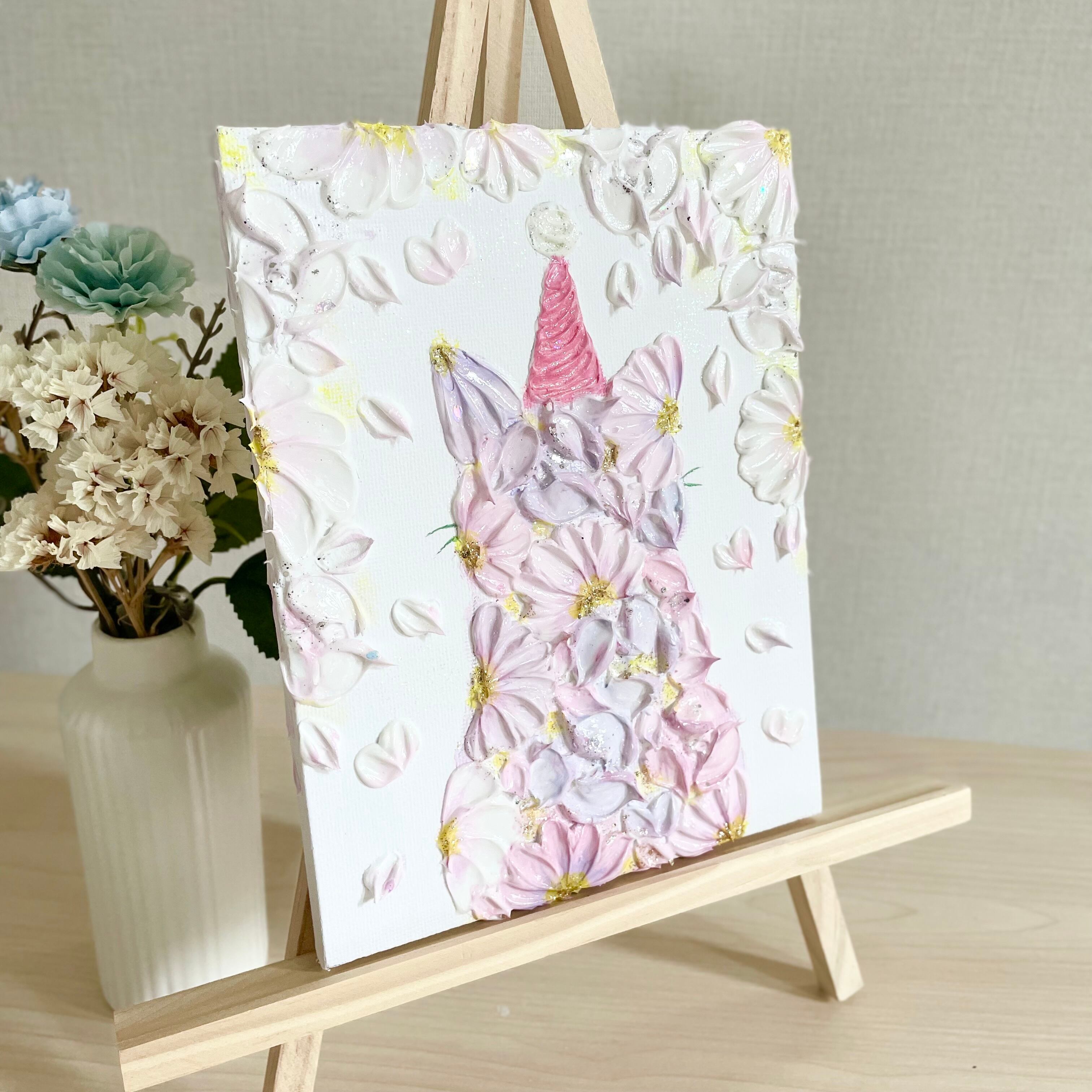 花で描いた猫のキャンバスアート。
