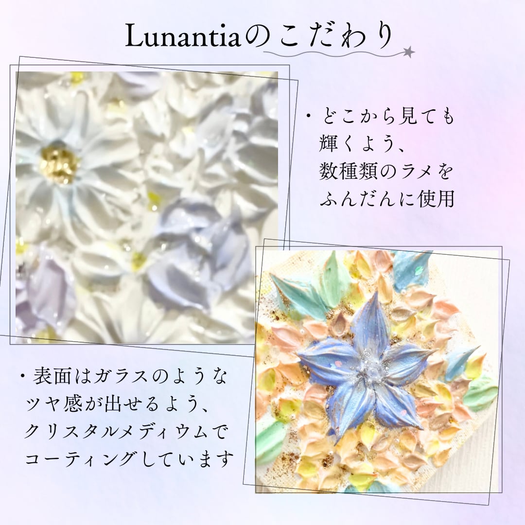 おもにモデリングペースト、アクリル絵の具、クリスタルメディウムを使用しています。