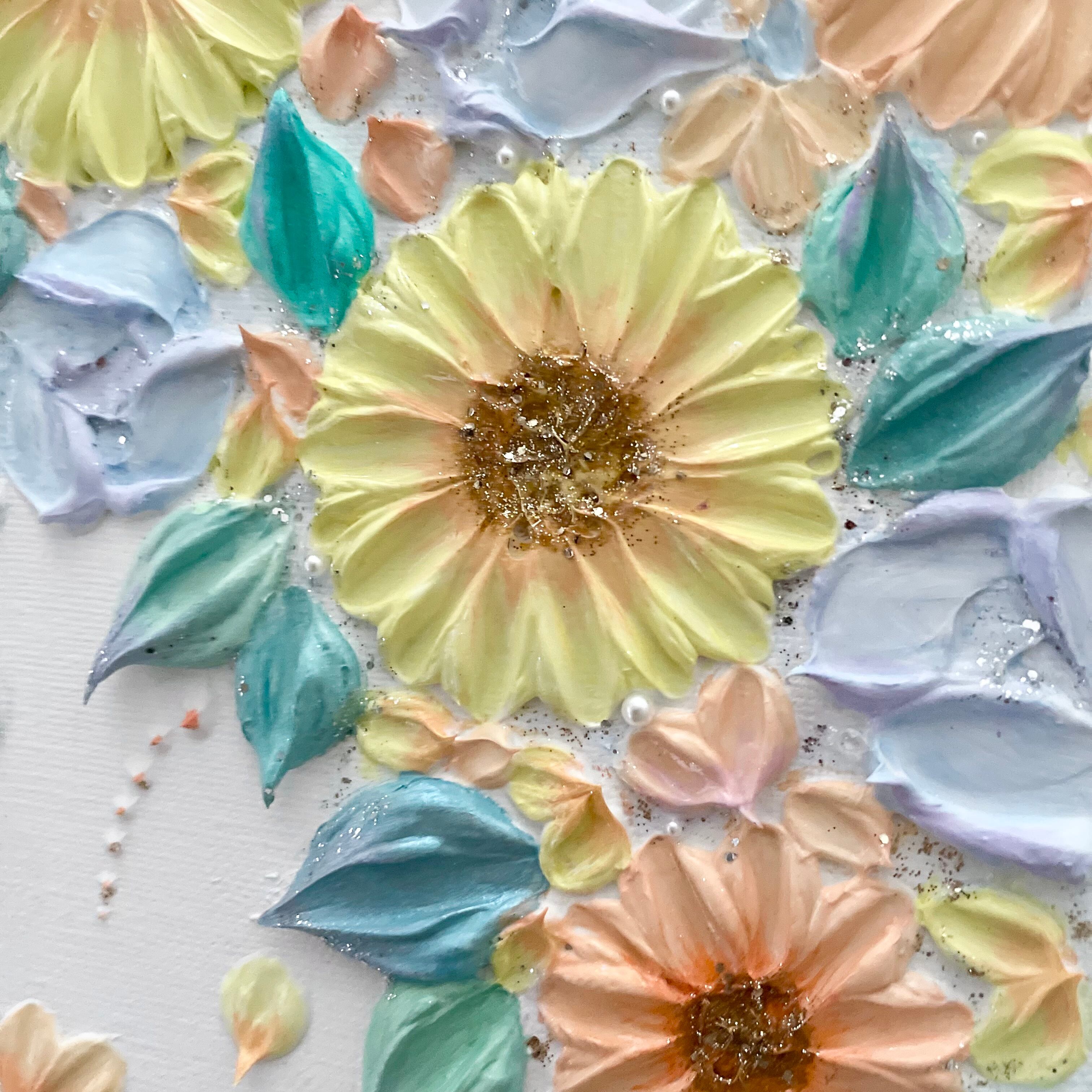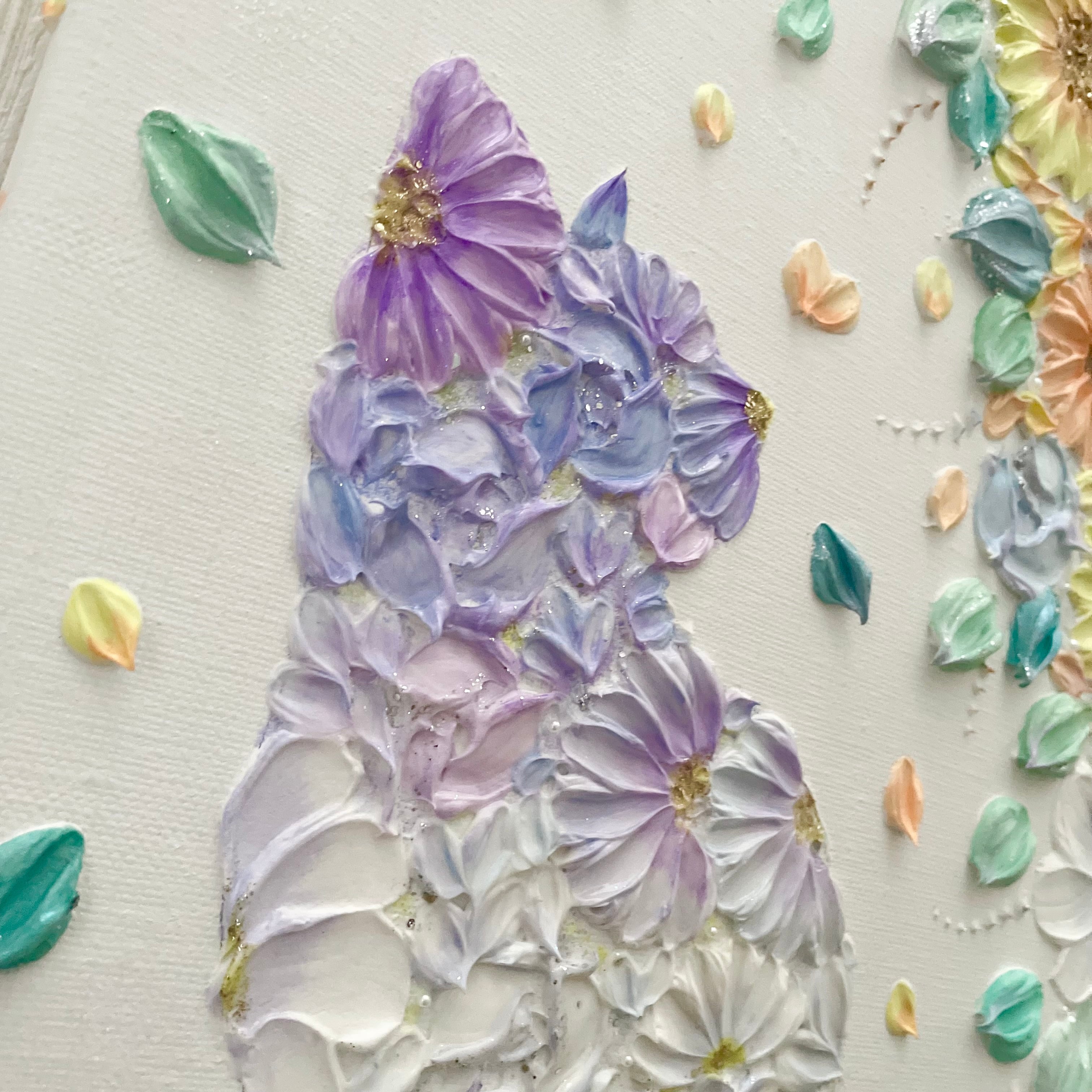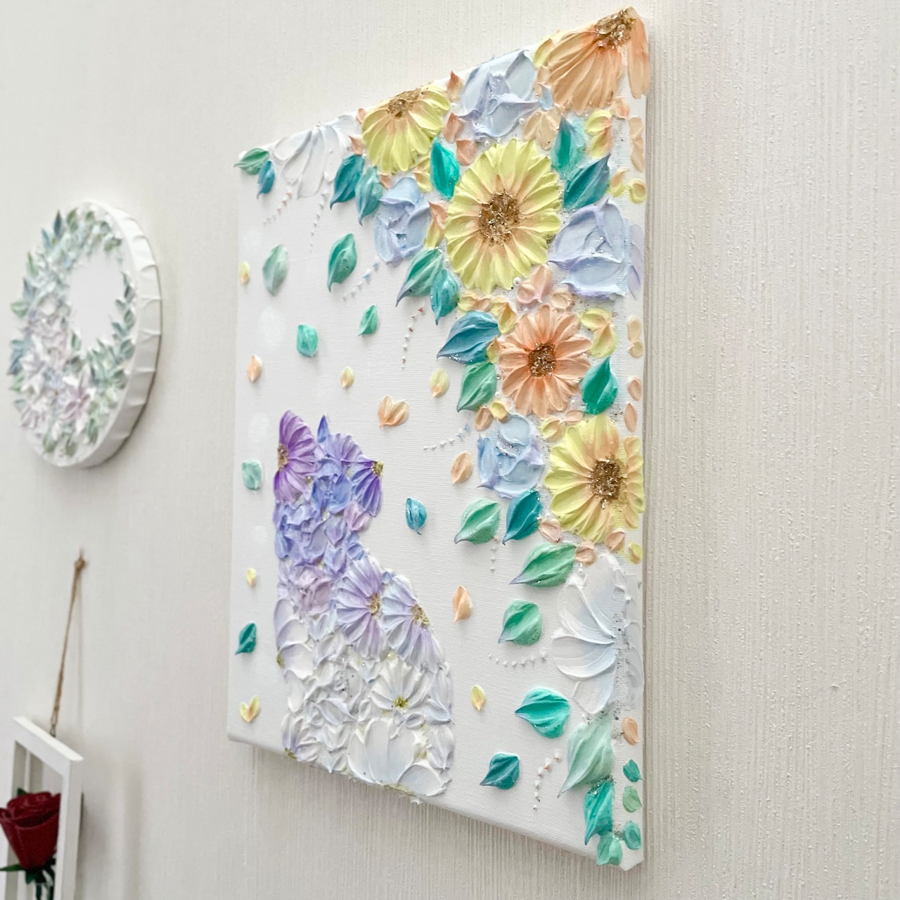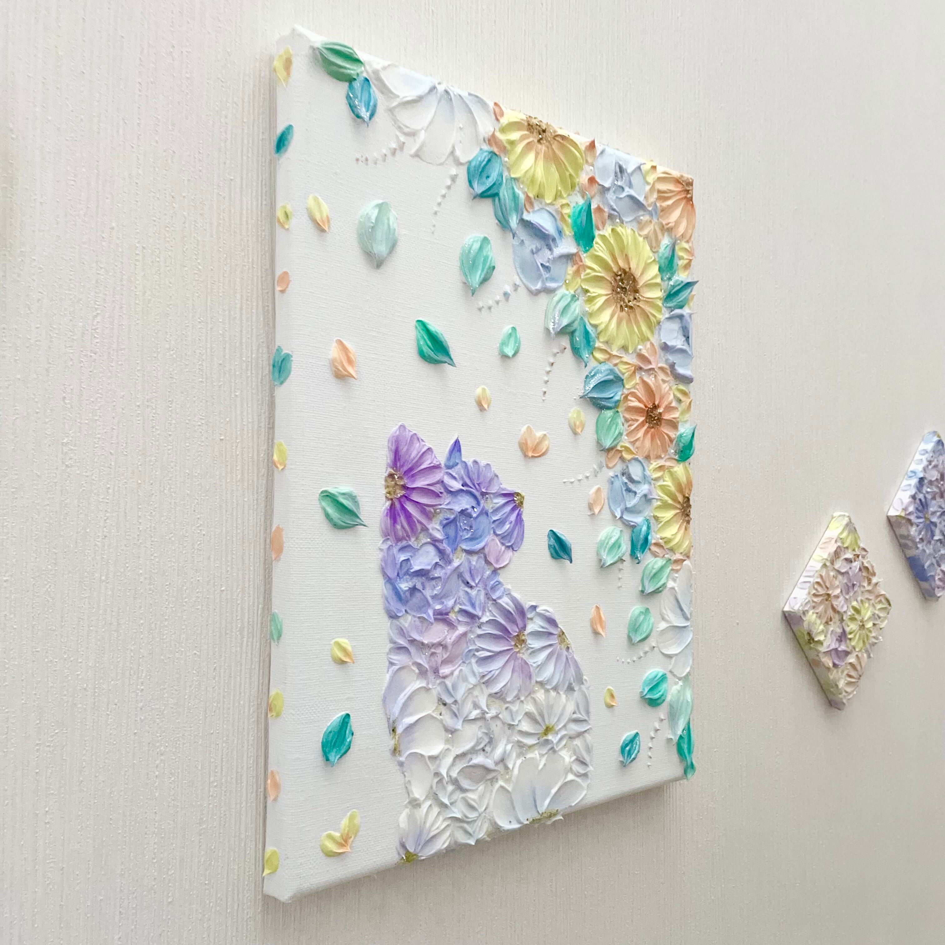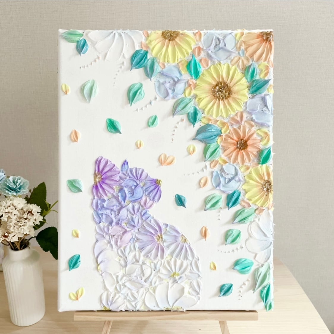 宝石のようにきらめく向日葵の光を受けて、眩しそうに目を細める猫の姿を、繊細なテクスチャーで立体的に仕上げました。