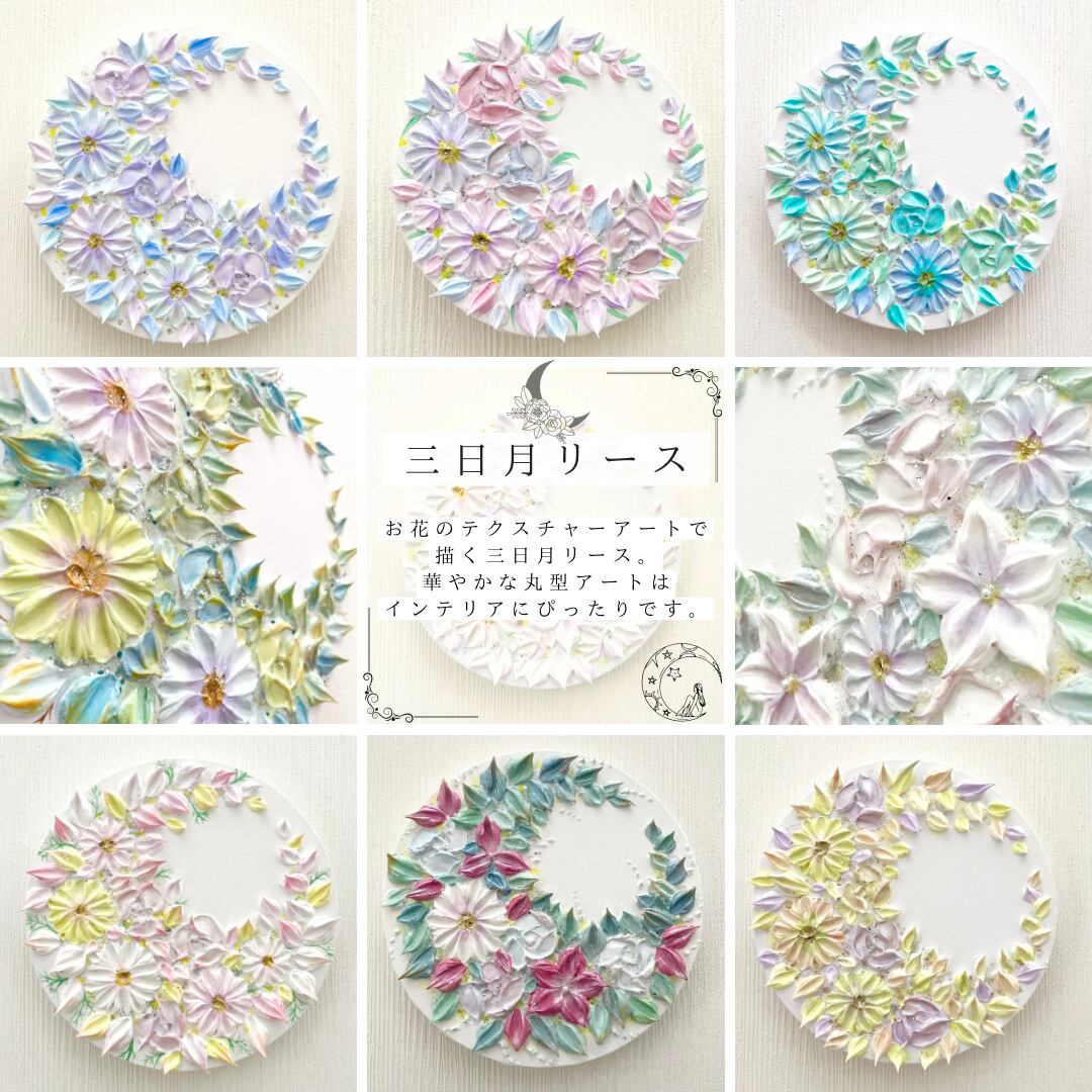 【受注制作】「銀の月環」15㎝ 三日月リース 花のテクスチャーアート