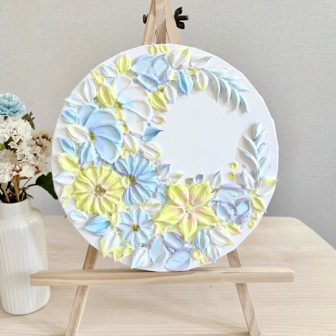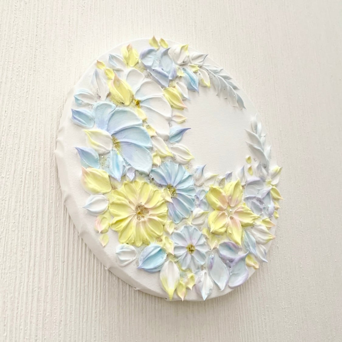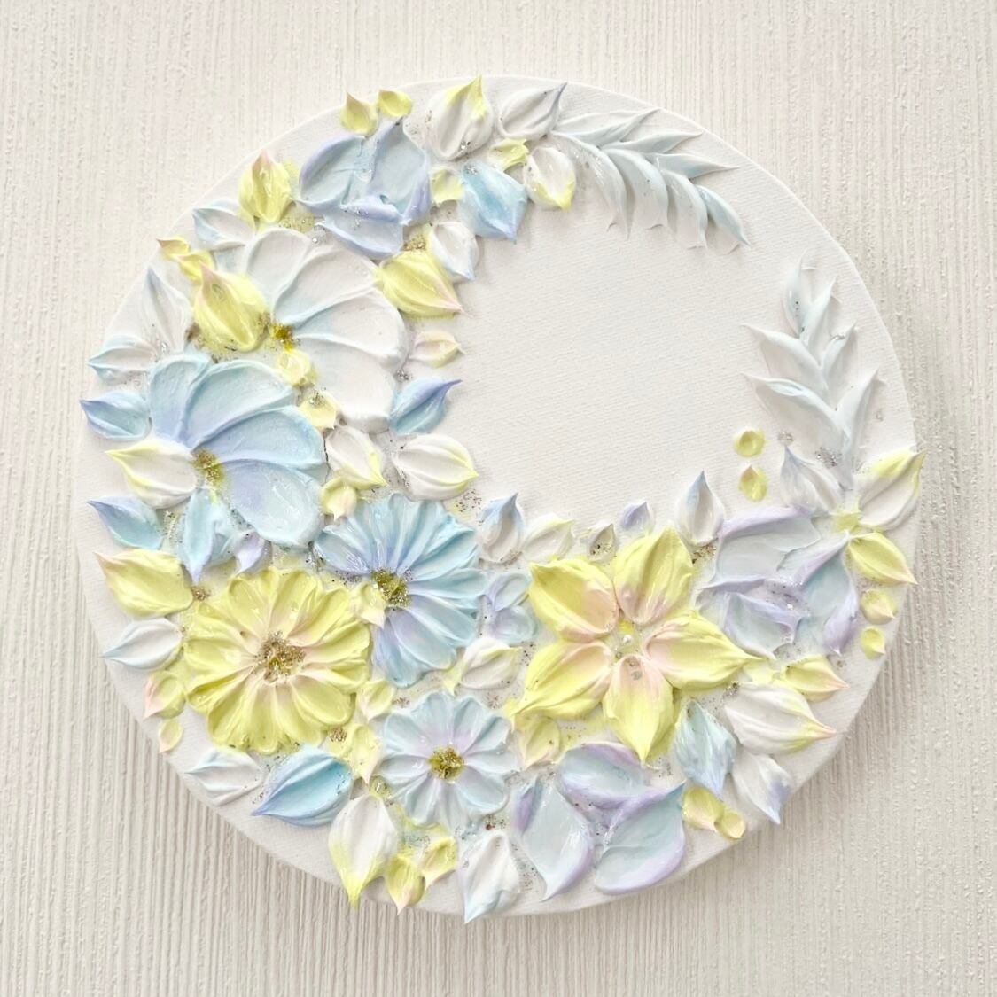 ❀ 思わず昼寝をしてしまいそうな、暖かく穏やかな時間の空。やさしい太陽の光と、柔らかく広がる空と雲を思わせる黄色と水色で、三日月のかたちをした花のリースを描きました。