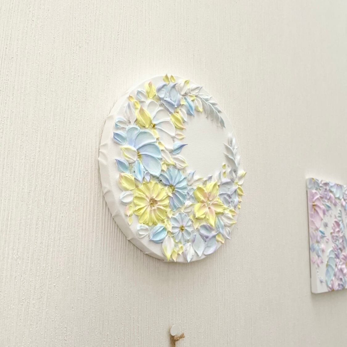 立体的に咲く花々と、角度で表情を変えるラメの煌めきが、省スペースの壁でもパッと一目で印象を残します。