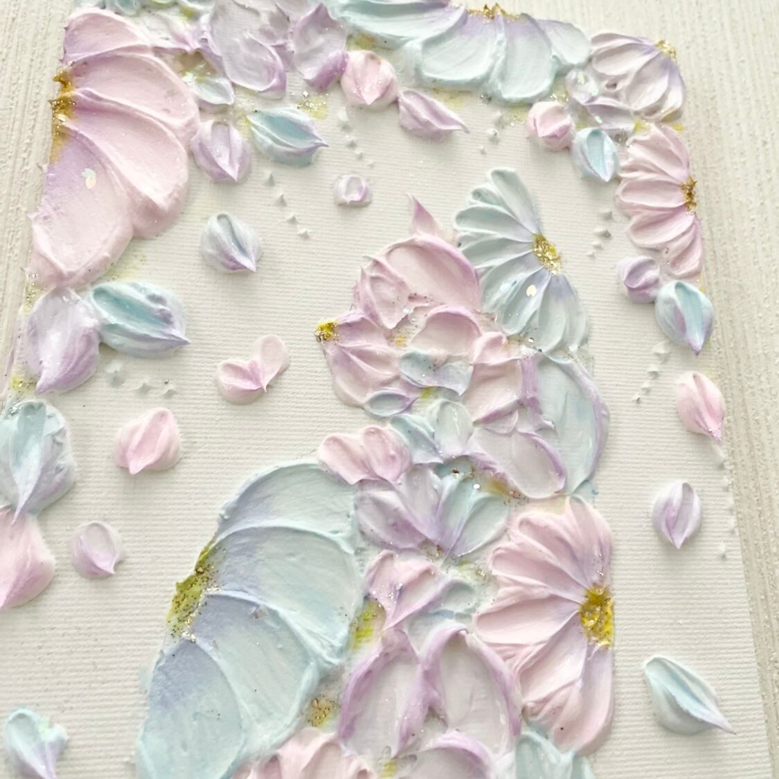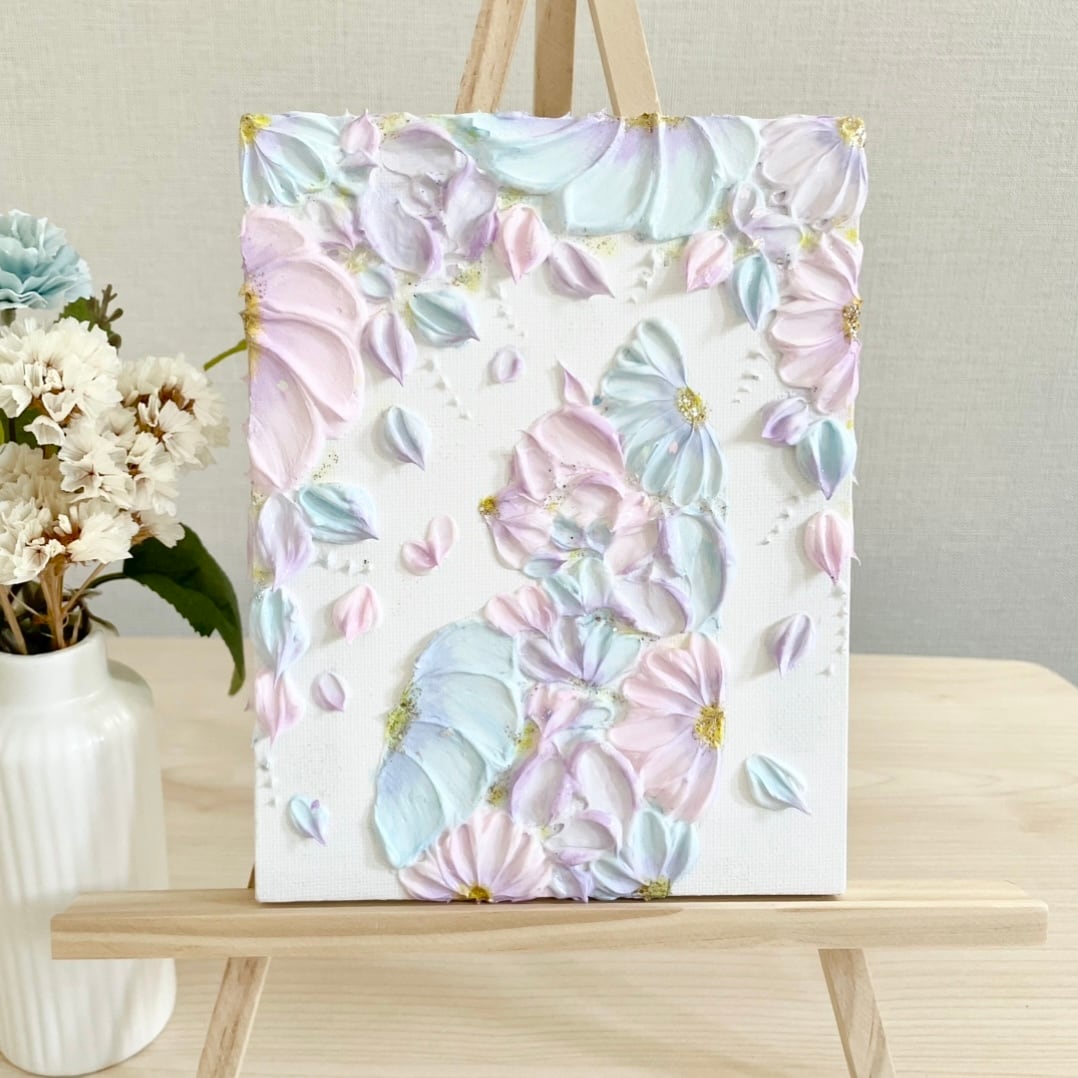 春のやわらかな光に包まれるような、パステルピンクと水色で描いた花猫さん。
