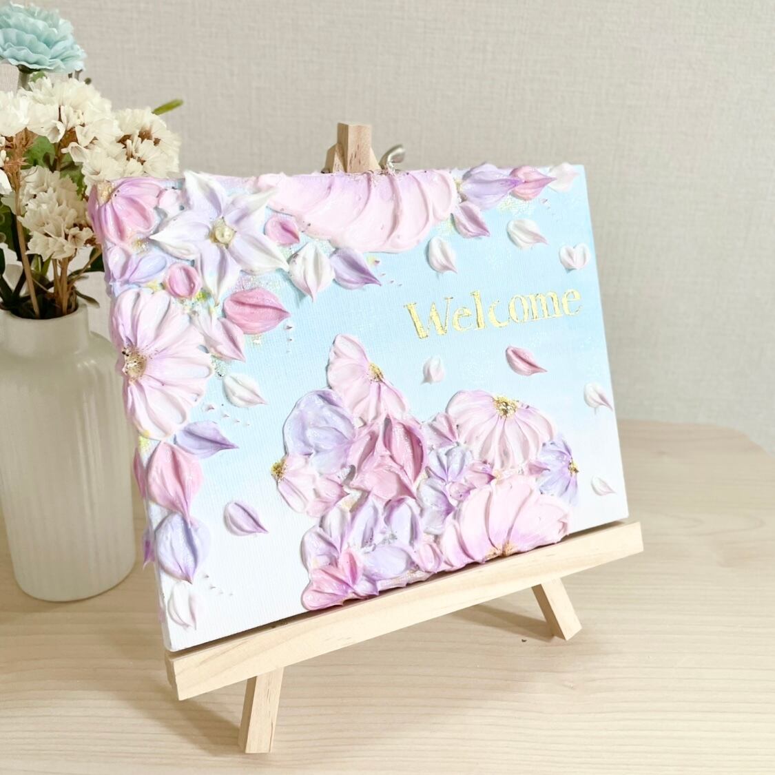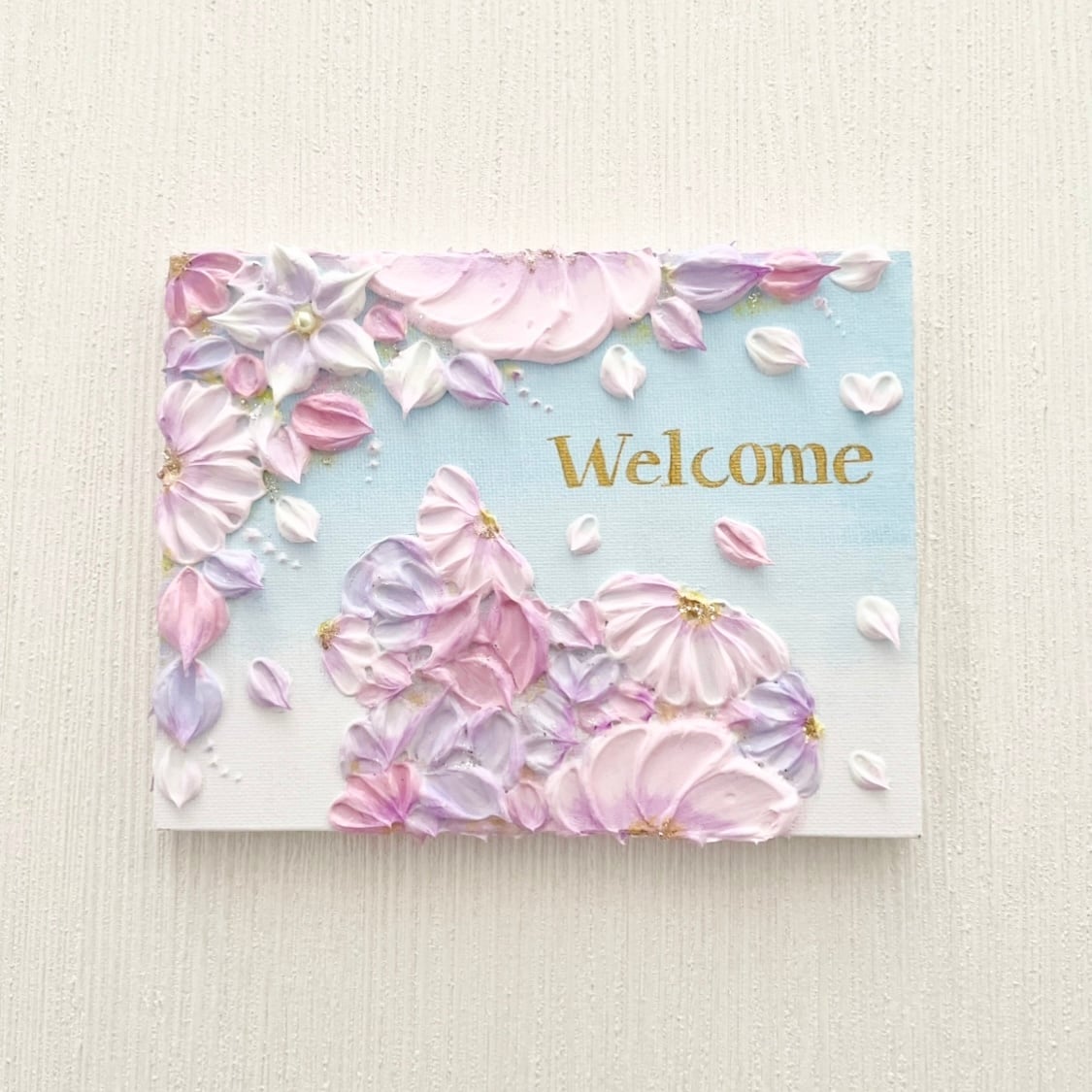 「花猫の歓迎」 18×14㎝ 花のテクスチャーアート 玄関のウェルカムボード 猫のインテリア