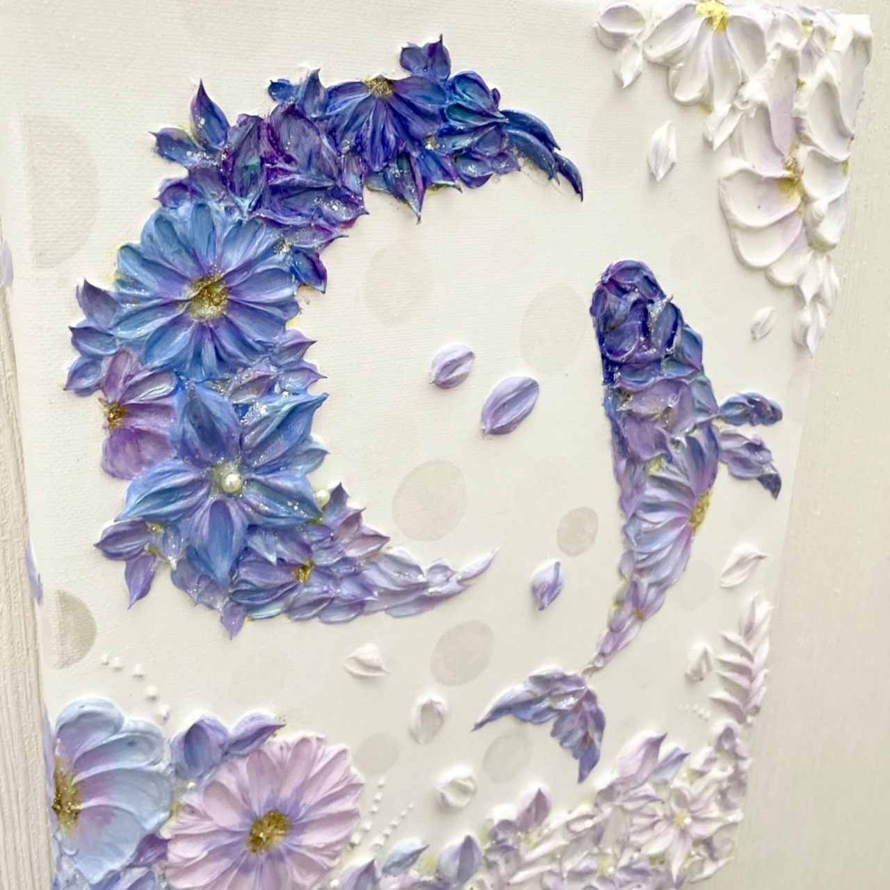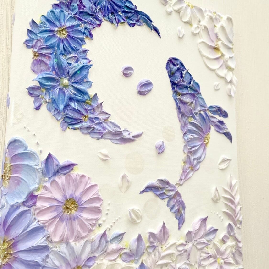 「花和の幸来」35×27㎝ 玄関インテリア 花のテクスチャーアート 鯨のアート 引っ越し祝い 月のインテリア